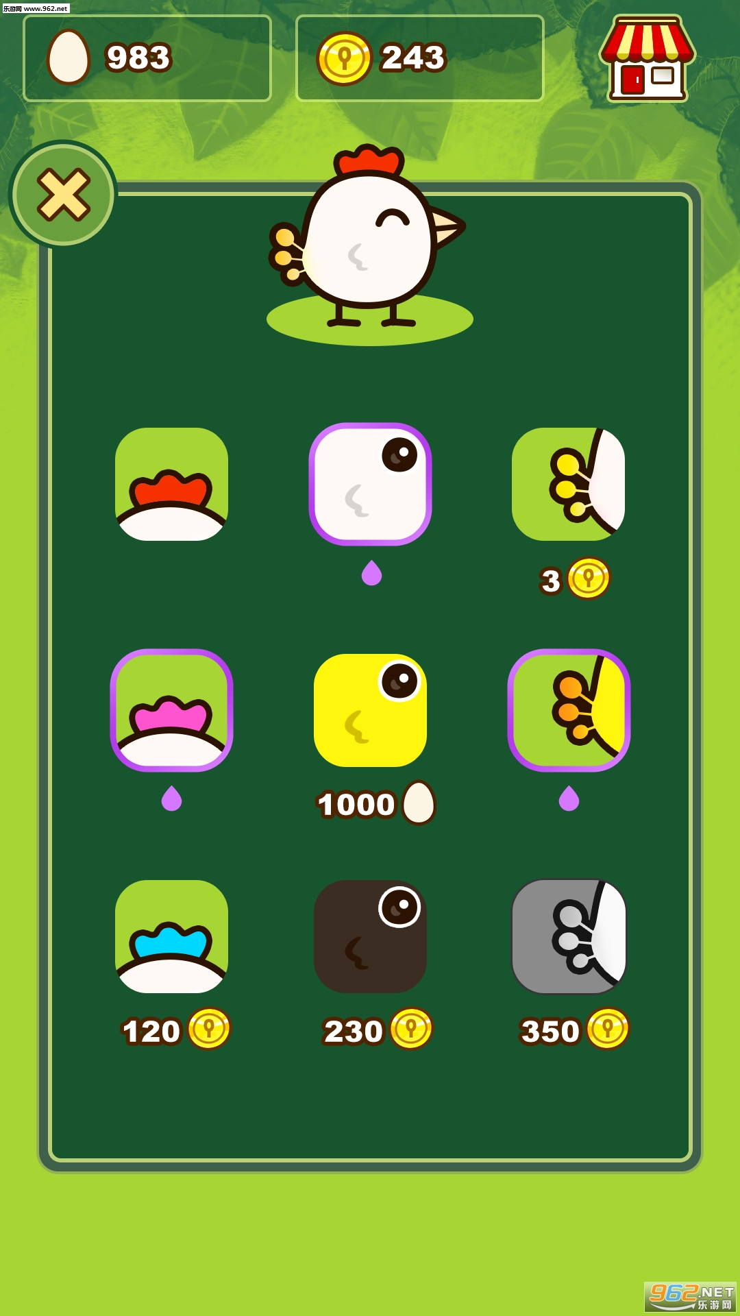 3. 屏幕右上角的商店中有许多配色,但是需要用金币和鸡蛋购买!只要你有足够多的金币和鸡蛋就可以得到所有的颜色了!