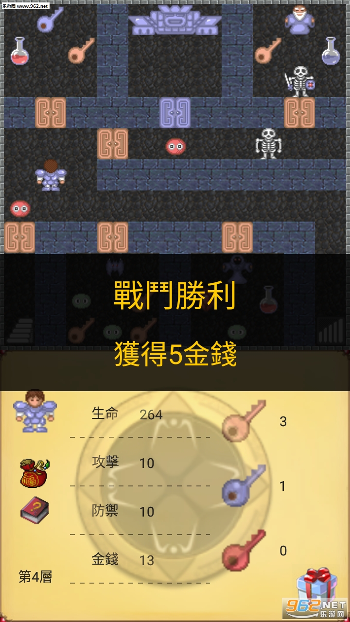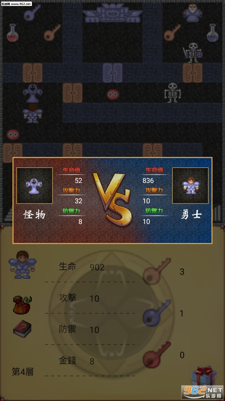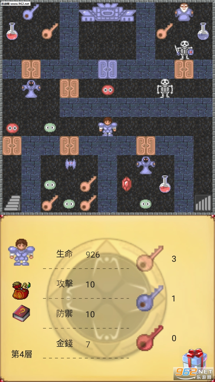魔塔50层勇者的试炼是一种固定数值RPG游戏。这个游戏需要动很多脑筋,任何一个轻率的选择都可能导致游戏的失败,还可以锻炼游戏者的数学能力。 基本操作方法:通过点击屏幕进行移动,接触物品会自动拾取,一部分物品会显示在物品栏里供玩家使用。遇到怪物会自动攻击,不进行攻击表示遭遇这场战斗会导致角色HP低于0而死亡。