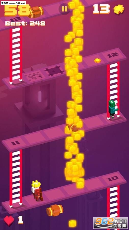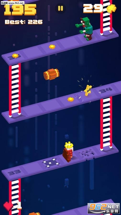 游戏的玩法是比较简单直观的,玩家只需要不断的点击屏幕,控制我们的英雄不断向上攀爬,躲避从上方掉落下来的木桶以及地面上的陷阱即可。即便是这样,但是玩家想要到达更高的楼层,获得更高的游戏分数,还是需要玩家不断地练习才有可能完成的。而且当你所攀爬的楼层越来越高的时候,玩家所遇到的挑战也将会越来越难,会出现僵尸和熔岩池,以及其他的危险等。所以玩家还是需要小心应对哦!