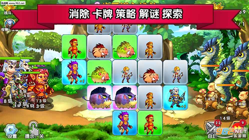 每个关卡限定移动步数,可以自由移动池内角色,当横竖斜凑齐三个以上相同角色后将消除成一个进阶角色,同时在战斗场上添加一个当前等级角色。步数用尽后将自动战斗,进行兵力消耗战。一般(只是一般!)战斗力高的一方胜。