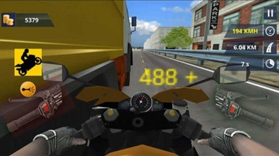 1、游戏使用第一人称世界。玩家需要控制摩托车在许多车辆之间穿梭以反映技术。