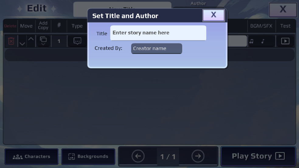创建自己的视觉小说,导出和导入朋友的故事,或查看社区的顶级视觉小说!您还可以创建自己的角色或将自己的作品上传到游戏中!首先选择一个场景类别,可以是标题场景、对话场景、选择场景或新的路线分支场景!然后添加背景、角色和文字!接下来,您可以为场景添加背景音乐和音效!扭蛋物语,无限可能!