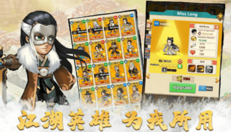 收集和培养英雄。各路江湖英雄具有不同的能力。了解并带领他们征服武侠世界。