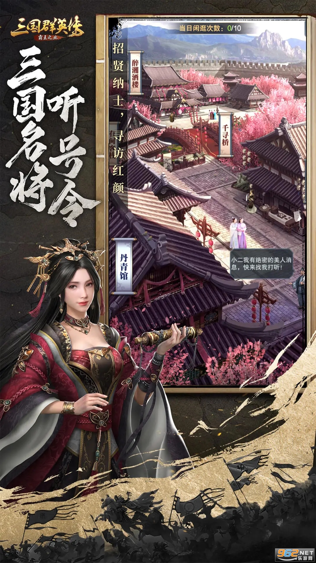 领略恢弘城池内景,宏伟宫殿,清晰江流、鲜活鱼儿等景像尽收眼底!《三国群英传-霸王之业》端游级的写实画风、独特的3D视觉效果为主公们打造顶级三国征战盛宴!升级宫殿,给各位文官武将分配职位;升级军事府、校场、兵营训练营,生产士兵到校场锻炼,提高综合兵力;建造集贤府,为主公们招募三国名将;建造珍宝阁,为主公寻找宝马名剑!城围外,农田、市场等资源产地也一应俱有,主公们还能派遣三国名将去下地种田或者铸币……模拟城邦经营,便捷建城立业的玩法,让主公们在这里演绎一方诸侯崛起之路,成就坐江山拥红颜的君王梦!