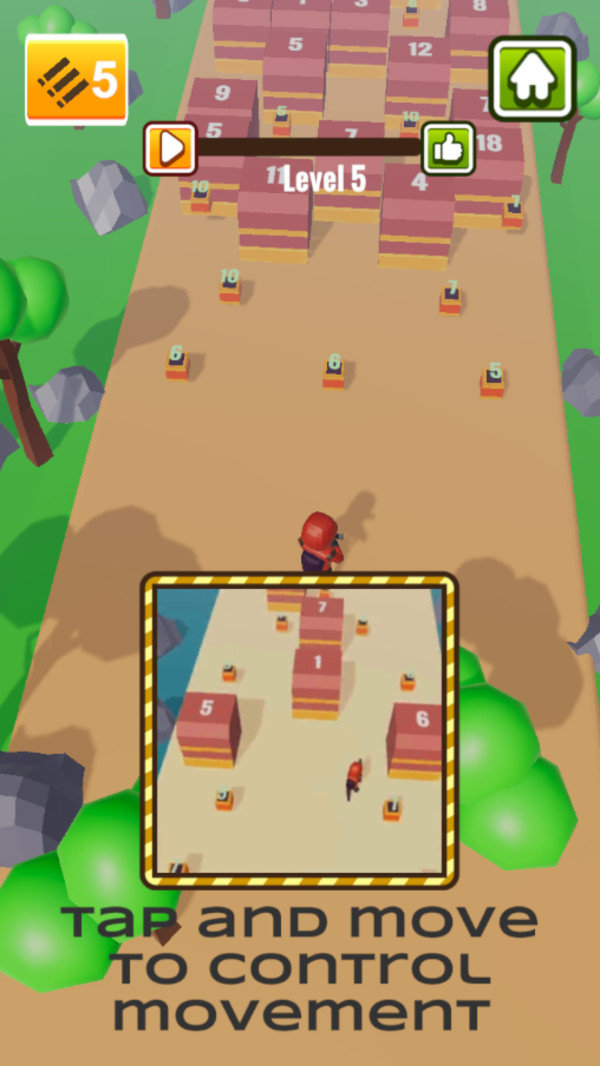 2.与角色一起移动并射击方块,拿起弹药并快速躲闪,避免迎面而来的不同攻击更好的进行应对完成挑战.