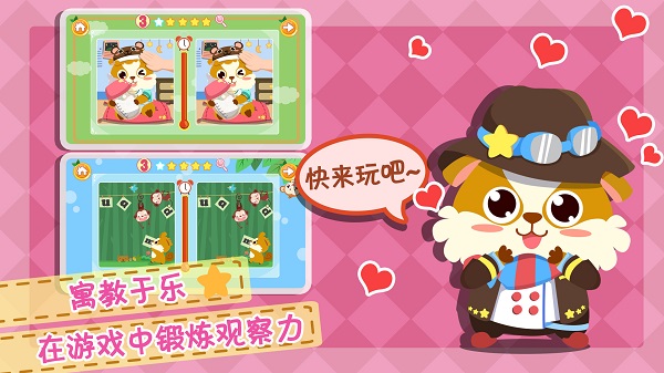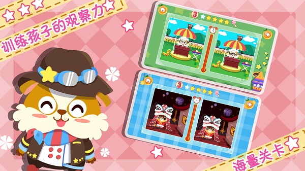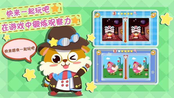 儿童益智找茬游戏是一款早教游戏,这款游戏都是卡通的风格,宝宝需要在两幅大致相同的画中找到不同的点,锻炼孩子的观察能力。里面有精美的画面和轻松的音乐伴随着孩子玩耍,感兴趣的朋友快来下载吧!