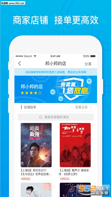 卖票邦是上海尧艺网络科技有限公司为现场文化演出及体育赛事等相关行业的票务交易提供的专业交易服务工具平台,致力于为演出赛事行业的企业、商家及从业个人在票品销售过程中提供更为便捷、高效的服务,并助力行业更健康地发展。