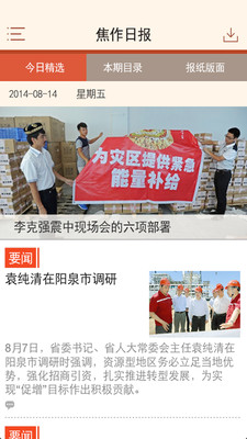 3.焦作日报新闻客户端操作界面共设七大功能,在时尚、便捷的侧滑抽屉式菜单提示下,用户不仅可阅读、下载一周内的报纸,还可将新闻资讯、互动、专题速递、我的收藏、更多设置等尽收囊中。在时政、社会、文化、国际、经济、体育、地方、图片等新闻资讯板块下,领略怀川之美,点击博闻天下。用户还可操作评论与分享功能,将自己所思所想与他人分享品读。