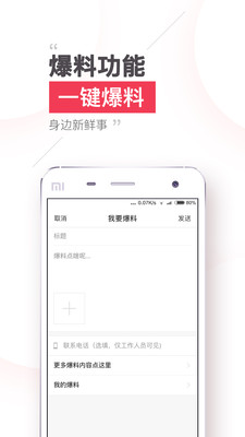 随时随地上传相关事件的照片和文字,一键爆料身边新鲜事,千人爆料团等你来加入,更有红包等你领取。