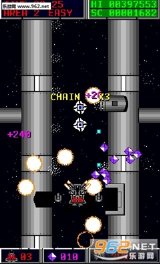 垂直卷轴滚动射击类游戏。游戏画面简洁,玩法也容易,是一款消磨时间的好游戏