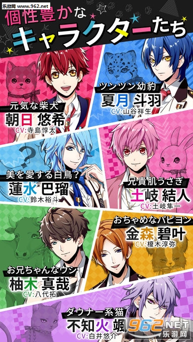 《动物偶像(アニドルカラーズ)》是一款由日本 VOLTAGE 公司推出的新游戏企画概念「VOLTAGE DREAM」系列中的第一弹作品,是以养成动物拟人化的美男子偶像为主题的。