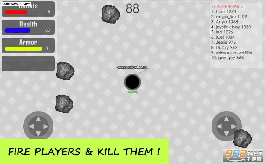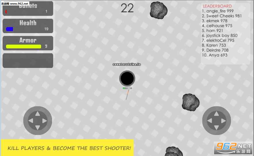 一款十分好玩的射击手游,玩家在这款手游中将会去扮演一名士兵,将自己的枪支朝着自己的敌人,不断的进行射击,获得更多的积分登上排行榜的第一名。需要注意的是,随时观察对手的子弹情况,当发现自己的对手正在处于换弹真空期的时候,不断朝着他射击,确定自己的优势。当你的使用较重的武器和盔甲的时候会影响你的速度,尽量使用较轻的盔甲和武器吧!