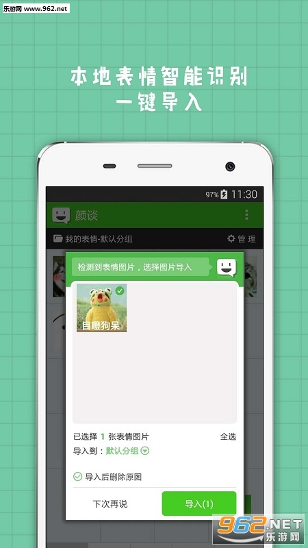 有了颜谈-表情管理神器,以上问题统统迎刃而解!通过颜谈App,你可以将其他应用中发现的表情图片下载到本地,通过App自动智能识别导入,方便地进行统一管理。需要发送时,一键点击发送库中表情,省心省力,是各种聊天不发表情会死星人的不二选择!