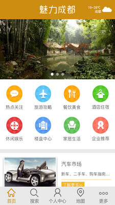 魅力成都是一款集当地生活、资讯、服务为一体的本地化客户端,全面整合城市生活、旅游出行、行业等相关信息。客户端共涉及12项应用内容,包括热点关注,旅游攻略,餐饮美食,酒店住宿,休闲娱乐,楼盘中心,家居生活,汽车市场,教育医疗,企业推荐,人才招聘,便民服务