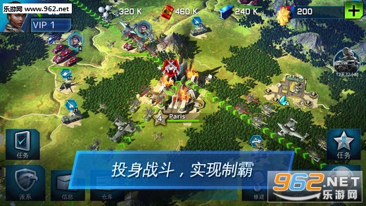 当整个世界饱受战乱之苦时,骁勇善战的将领们揭竿而起,率领他们的心腹大军赶赴世界战场!保家卫国,匹夫有责!你,准备好了吗?赶快建立基地,带领军队攻城掠地,征服世界成就霸业!