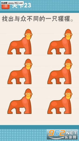 23关卡,找出与众不同的一只猩猩。将左下角的猩猩移开,就可以看到一只变异的猩猩。