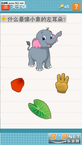 1关卡,什么最像小象的耳朵。当然是小象自己的耳朵最像它的耳朵了,只要点击下小象的耳朵就可以过关。