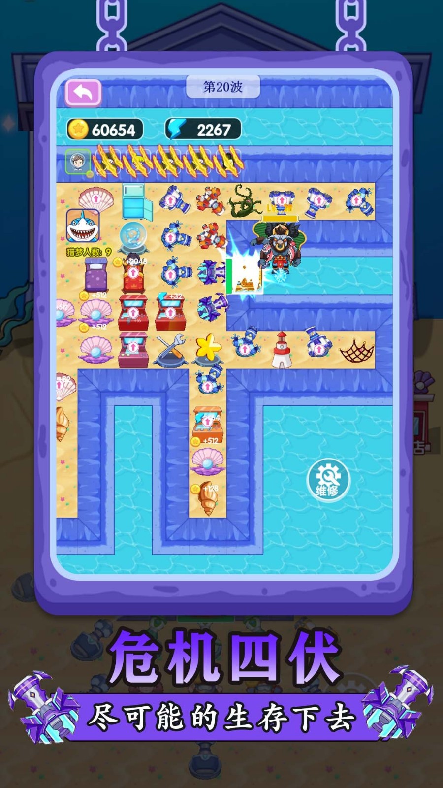 5、玩家可以收集装备来搭建坚固的防御阵线,阻拦鲨鱼入侵的步伐。