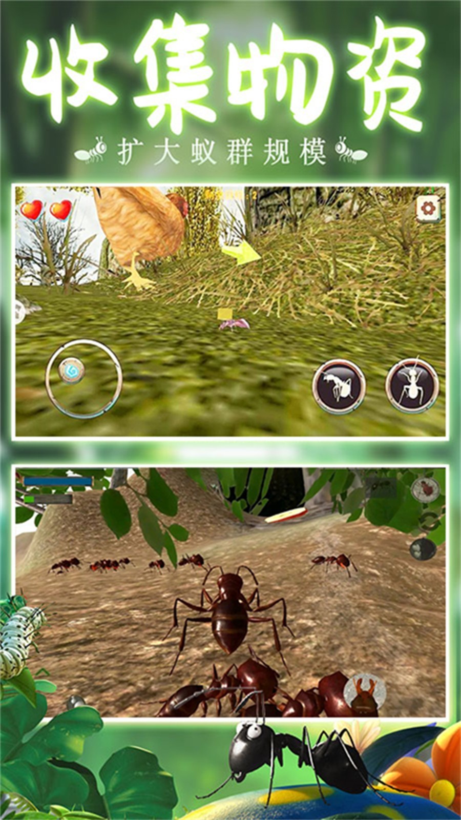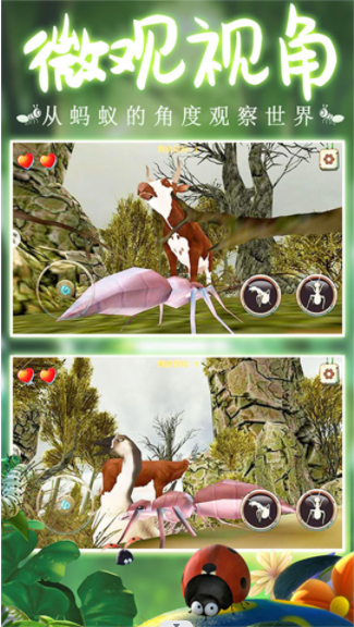 模拟蚂蚁大作战是一款让大家通过蚂蚁的视角去观看世界的模拟手游,玩家们能够在游戏中见识到各种各样不同的欢乐玩法,并且在游戏里面,你还需要团结同伴来一起寻找食物,一个人的力量是有限的,只有跟同伴一起行动,才能够发挥出最强大的能量,快来游戏中体验一下别样的昆虫世界吧。