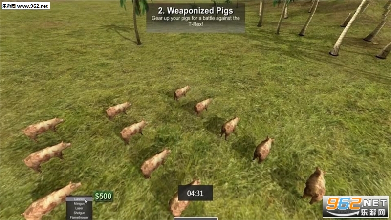 最与众不同的是,这款游戏还为这些恐龙和野兽提供了战斗用的武器,从大炮、加特林到激光枪、喷火器,你可以把各种现代武器装备到野兽们的各个部位上,于是就有了喷火霸王龙、自爆猪、加特林狗等即荒唐但又带有一些特殊美感的生物。除此之外你还可以放置防御炮塔,包括机枪塔、喷火炮塔霰弹炮塔等,来增加某一方的战斗力。