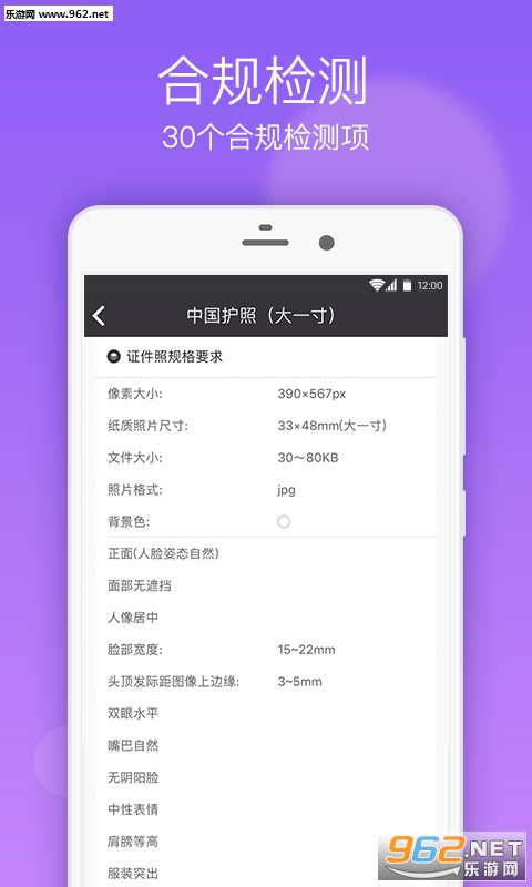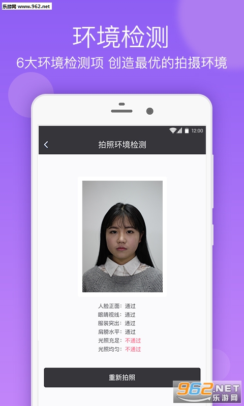 严格的拍摄环境检测,对人脸姿态、眼睛视线、双眼水平、服装突出、肩膀水平、光照充足、光线均匀进行检测,确保用户拍摄出合格的证件照。