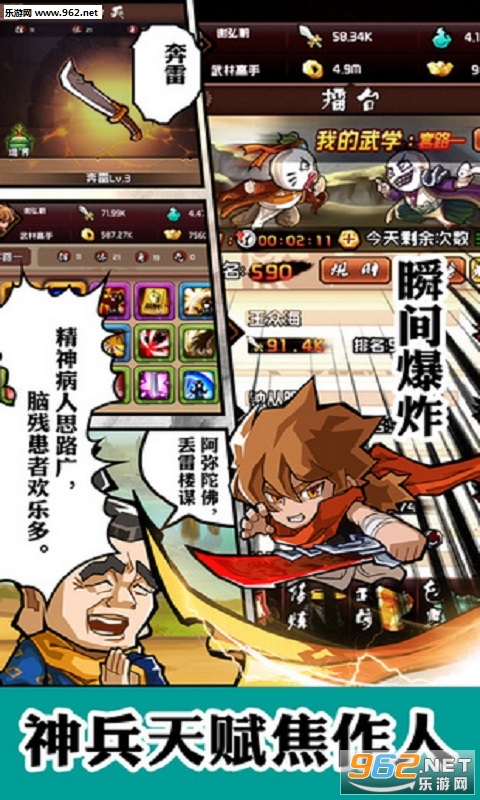 《暴漫江湖安卓版》是一款由暴走漫画官方授权的手机游戏,游戏玩法多样,结合了角色养成,武学收集,冒险闯关,武学修炼等诸多趣味元素,保证让你每天乐不思蜀!游戏中的搞笑情节让你爆笑连连,感兴趣的玩家赶紧下载吧!