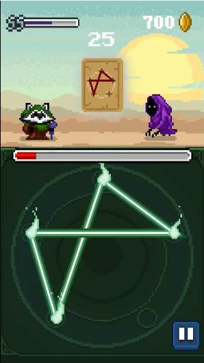 游戏出自开发商Ogre Pixel之手,此前他们曾经推出过一款名为《复古塔防》的塔防类游戏作品,而本作虽然与其在游戏类型上完全不同,但是却也同样的采用了复古的像素风格的游戏画面设计。在游戏中当玩家遇到了敌人之后,玩家需要用手指在屏幕上滑动将画面中的点连接成特定的图形才可以使用攻击技能,而且画图案的时间是有限的,玩家需要尽快完成才可以基于敌人更多的伤害,这在同类型的游戏作品中还是一种比较少见的玩法,相信还是能够给予玩家一种全新的游戏体验。