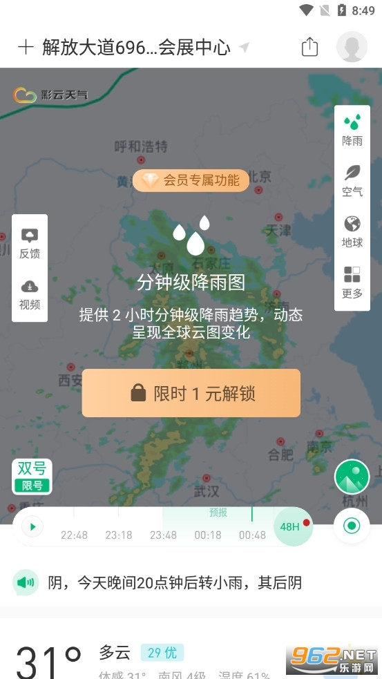 彩云天气可以在手机地图上流畅显示整个城市的降雨量动画,帮助您直观看到当前地区的降雨量变化。通过彩云天气,你可以直观看到风暴的路径,自己预测未来降雨的情况。