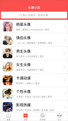 【个性】提供10大分类,200多个子类,分类清晰明确,快速定位自己的爱好。让你的头像与众不同,个性十足。