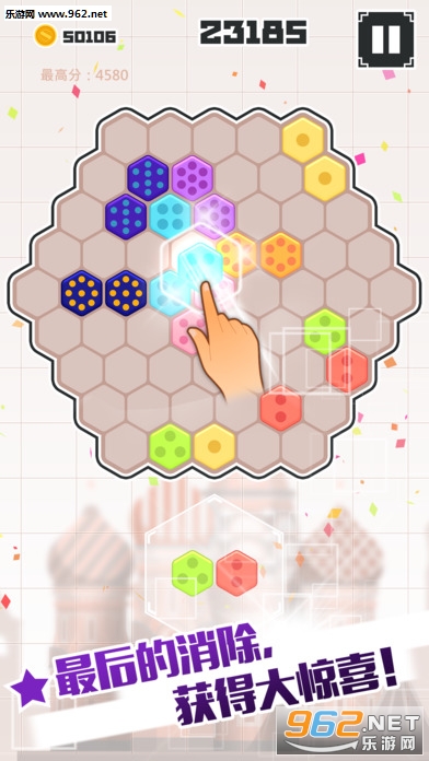 蜂巢状的面板随意摆放,在三条线上完成点数升级即可消除,最多可以达到7层,最终获得爆炸奖励。