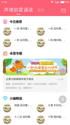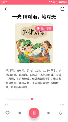 《声律启蒙诵读app》是一款专门为小朋友们打造的阅读朗诵软件,宝宝能够跟着软件进行跟读,还能自己进行录制,帮助孩子培养学习兴趣的同时,让他们能够了解更多的古诗文知识。有需求的话就快来下载吧!
