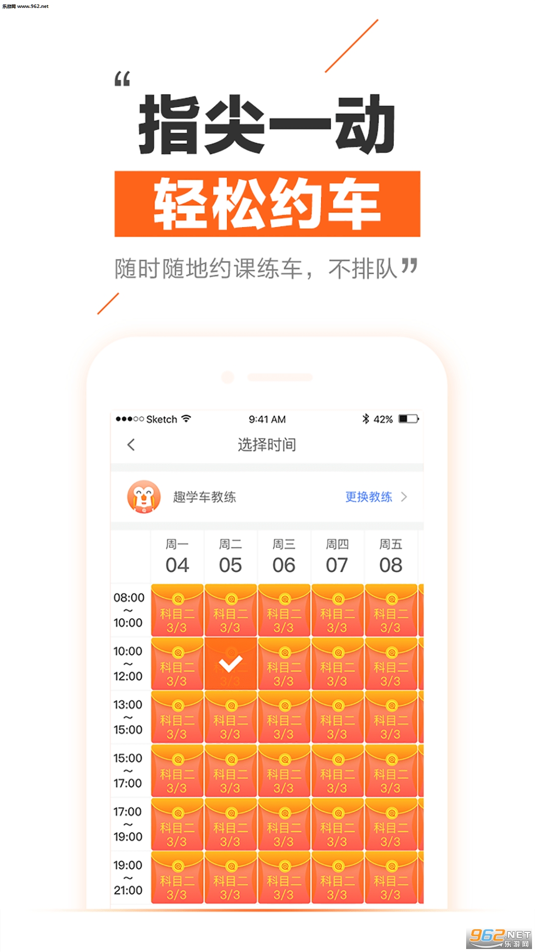 使用APP在线预约练车,还可自由选择教练,合理安排练车时间,解除排队等待的痛苦。