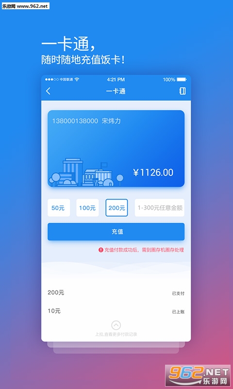 一卡通充值( 200多家银行,免手续费 )通过手机APP或网页,10秒完成饭卡充值!支持国内大部分一卡通,支持一卡通在线挂失,消费记录查询.