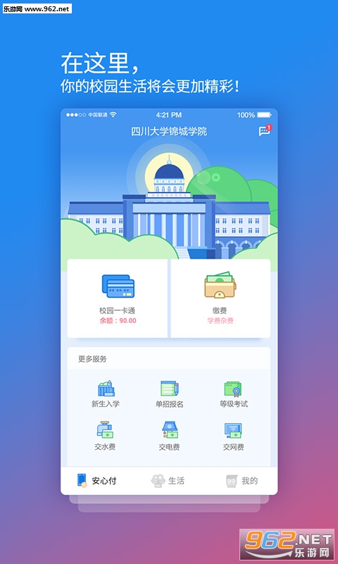 《校园安心付官方版》为校园定制搭建自有、自管、自运营的跨行支付平台,在线充值一卡通,在线缴纳各种费用,《校园安心付官方版》从此学生告别排队烦恼,学校后台无限制自定义缴费项,结合教务财务系统轻松管理。