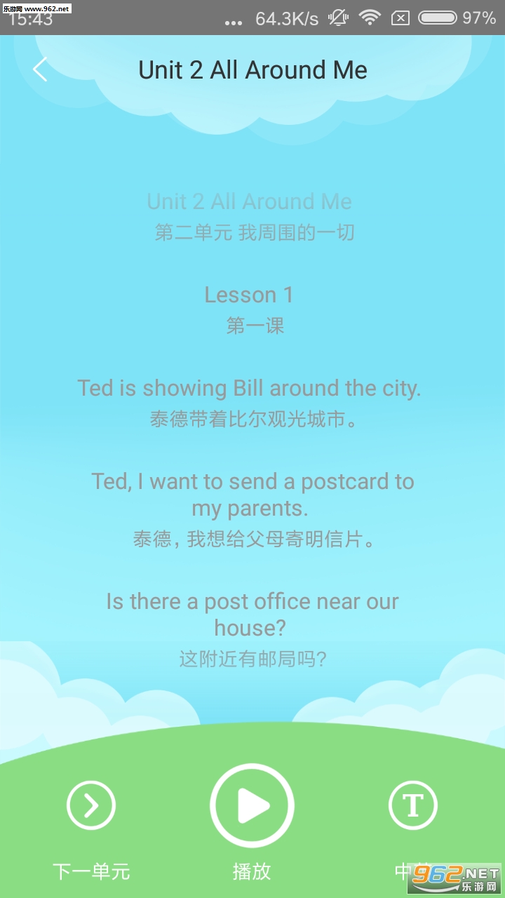 点选教材版本和年级后,直接进入课文单元页面,随便点击一单元,进入了点读页面。(点读页面)这里的设计清爽宜人,功能区分明确,可以整篇朗读,支持黑屏朗读;也可单点某句朗读,亦可中英对照、中文翻译、英语显示,速度响应还算可以,整体使用起来比较顺手,可以点个赞。