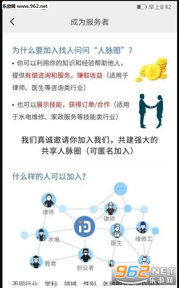 一款能够扩充你社交圈人脉圈的软件,用户能够在软件中发布自己的问题,找到专业的人士帮你解决,或者是帮助别人解决问题获取收益。