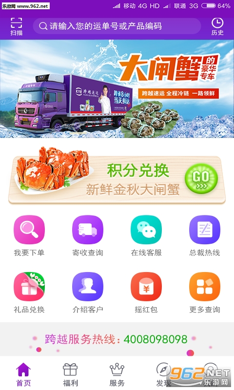 金秋的大闸蟹,贵就贵在鲜滋味!如何将大闸蟹运往全国各地依然保持鲜活?找跨越速运!全程冷运,一路领鲜!跨越速运APP集红包、积分兑好礼、介绍客户拿提成一体的快递APP,现在新增大闸蟹积分兑换,快来尝鲜阳澄湖大闸蟹吧。