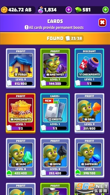 收集各种卡牌升级材料升级卡牌,从而增加黄金收入并获得更加强力的哥布林