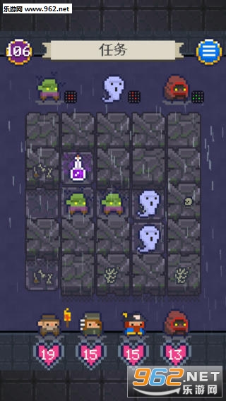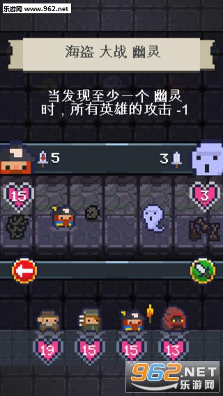 除了队员们的常量(攻防数值、技能)以外,你的队伍还存在着变量——队长技能。许多英雄都拥有自己的队长技,但只有将其委任为小队领袖之后才能激活。比如让法师(Cleric)真正成为“灵道”之后,它就能在每一回合结束之后自动祝福团队中血最少的成员(HP增加一点),大大减少不必要的减员。当然,你的敌人也不可能坐等披坚执锐的英雄团队上来“翻牌子”,不仅仅是直观的攻击力,它们只要现身,就会对周围的英雄产生各种Debuff。比如幽灵就会让相邻格子的英雄的攻击力下降一个点。木乃伊出现之后,队长就会被强制扣血。而每削去史莱姆一点血,它们的攻击力就会呈反比增加。