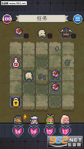 《冒险伙伴传奇(Tales of the Adventure Company)》的外表很容易让我们联想到iOS平台上的那部“扫雷式RPG”——《龙城寻宝(Dungelot)》。玩家的角色扮演冒险之旅并非是以像素游戏中常见的横板或者纵版样式展开,而是指挥英雄在一个5×5的格子上进行各种踏雷。就像“地雷”一样,那些实力派怪物的位置和具体种类,在格子上是不可见的(只能预判),因此玩起来只能是用“步步惊心”来形容。同时,除了早期地图以外,后面的战斗是靠默认的两名角色(无法选择,由系统随机指派)是根本无法应付的,更不要说还有封关Boss的存在。因此玩家还要拿出为“扫雷”导入逆向思维,踏入那些隐藏有中立英雄的格子,将其解救之后收编进自己的队伍。