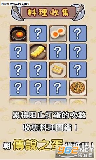 依成功阻止打蛋的次数不同将可以收集到各种不同的料理,这些料理会被收集在料理图鉴当中,听说阻止次数达1000次时,将会出现传说中的蛋唷!想知道这颗蛋最后的结局吗?那就努力的阻止这位疯狂的阿桑吧!