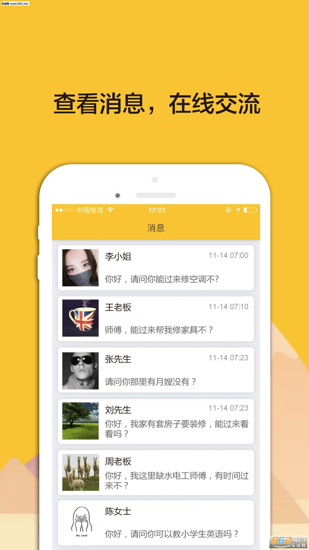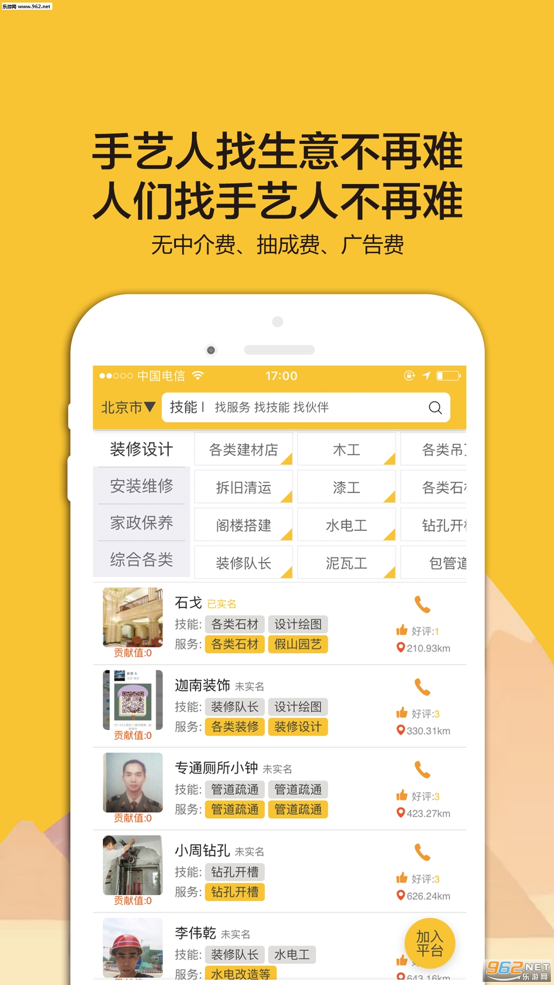一款非常实用的生活服务软件,让手艺人们不在为找生意而发愁,让人们也能直接方便的找到各种你需要的手艺人,还能直接利用平台在线交流,非常方便哦!