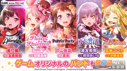 由五名青梅竹马所共同组成的王道女子摇滚乐团「Afterglow」、因为演艺事务所的企划而诞生的偶像乐团「Pastel*Palettes」、拥有高超技术的正统女子乐团「Roselia」,以及最后主打快乐、幸运、微笑的「Hallo Happy World!」等女子团体登场,各式各样充满不同特色的美少女乐团组合,将与玩家们展开一场不一样的邂逅体验!