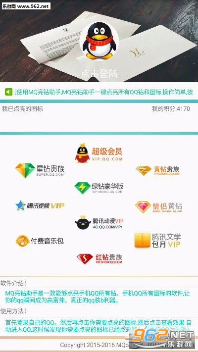 炫陌亮钻app是一款能够帮助用户快速点亮腾讯出品的产品钻石会员等服务的软件。通过本软件用户可以轻松的一键点亮QQ会员、QQ空间、腾讯文学以及QQ七钻等众多的会员图标一键点亮服务的软件。在这里所有的QQ图标均功能一键点亮哟。