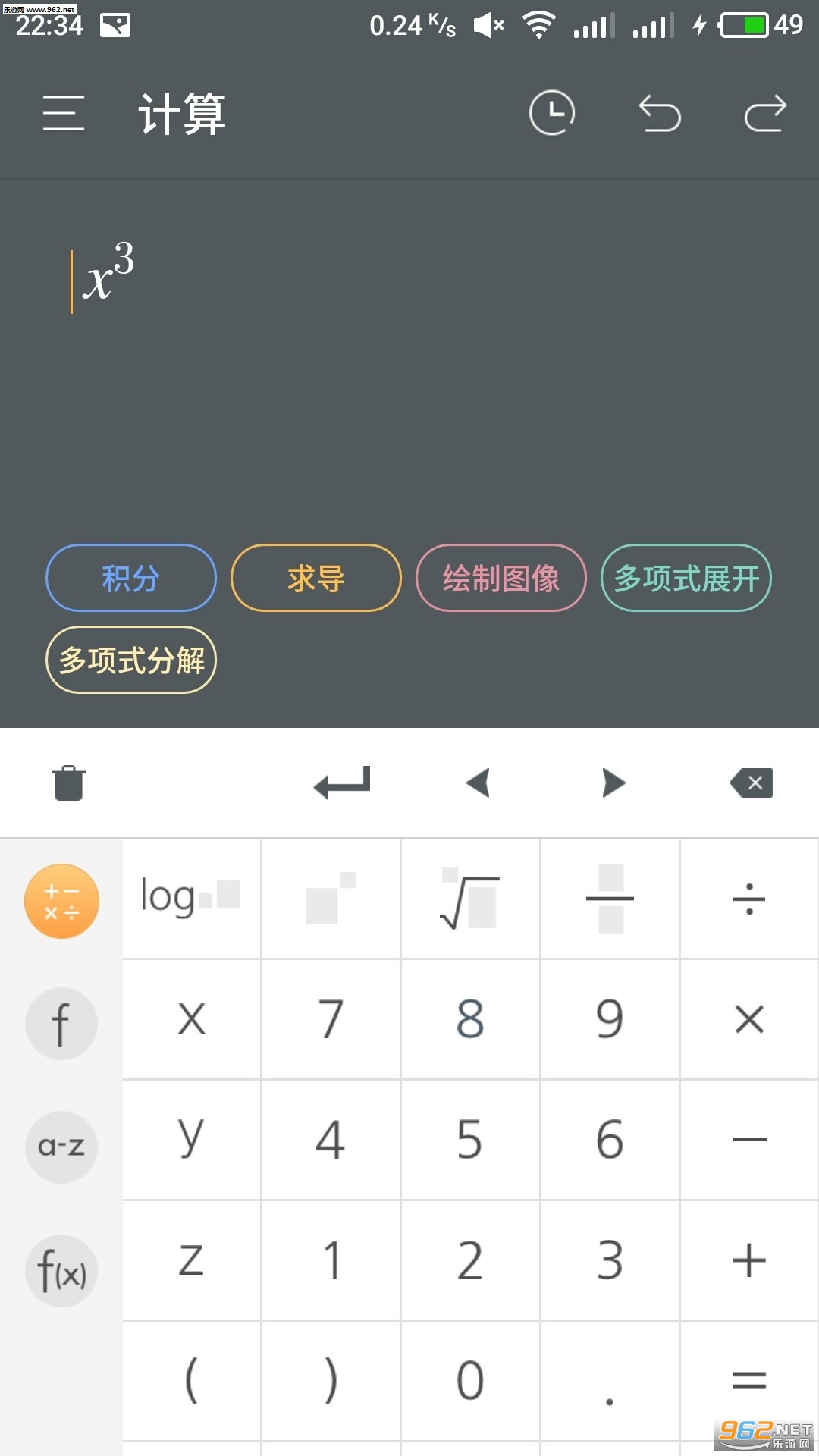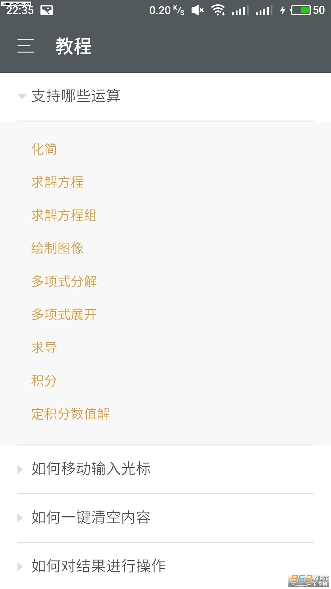 2、多种高级运算: 求根、求幂、求导、积分、方程组求解、三角函数、分式化简、因式分解、公式展开、公倍数、公因数、阶乘、绝对值,覆盖海量数学运算方式。