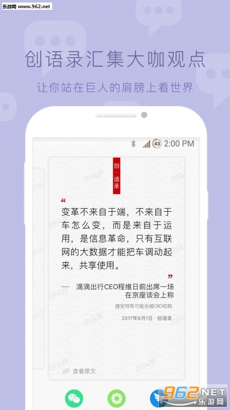 新闻文章、创业地图、创语录,都可分享到、、朋友圈、QQ空间等社交圈。