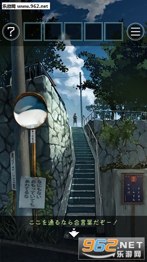 3,楼梯边上的看板上捡到杯盖,查看左边的倒车镜,等待三秒会有蝴蝶飞过。回家,记住蝴蝶和牵牛花的位置。楼梯场景向左有个放在三个杯子的断桥,把杯盖盖回去,调整杯盖位置得到提示。回到楼梯,查看右边看板,根据烟花的位置判断蝴蝶位置,得出暗号(なかま),输入,过关