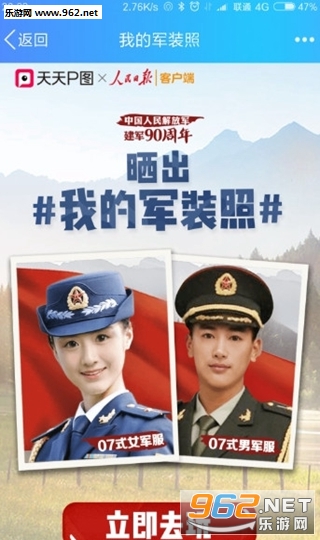 上最火的话题是什么?大概就是最近八一建军节的晒出你的军装照片吧,人民日报推荐了这款手机合成军装照软件,多种背景多种军装种类可选,海陆空应有尽有,看看你穿军装会是什么样的吧,下面为大家带来天天P图人民日报客服端下载!