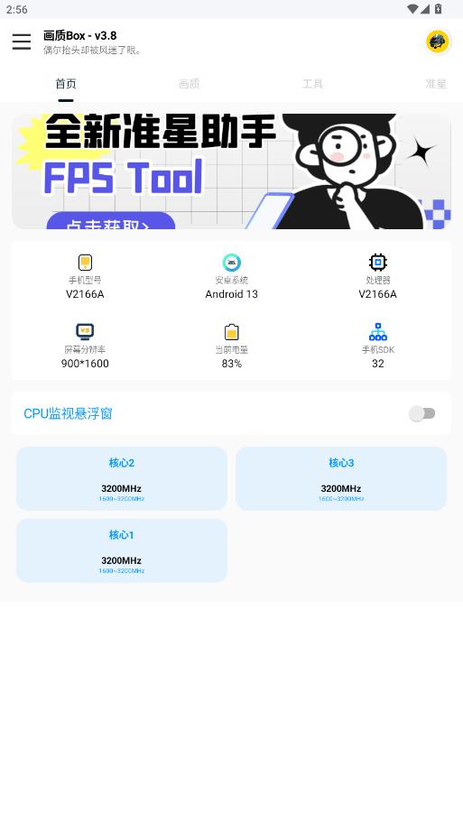 进入首页,可以查看手机型号,系统,处理器,分辨率,电量等,还可以点击开启CPU监视悬浮窗