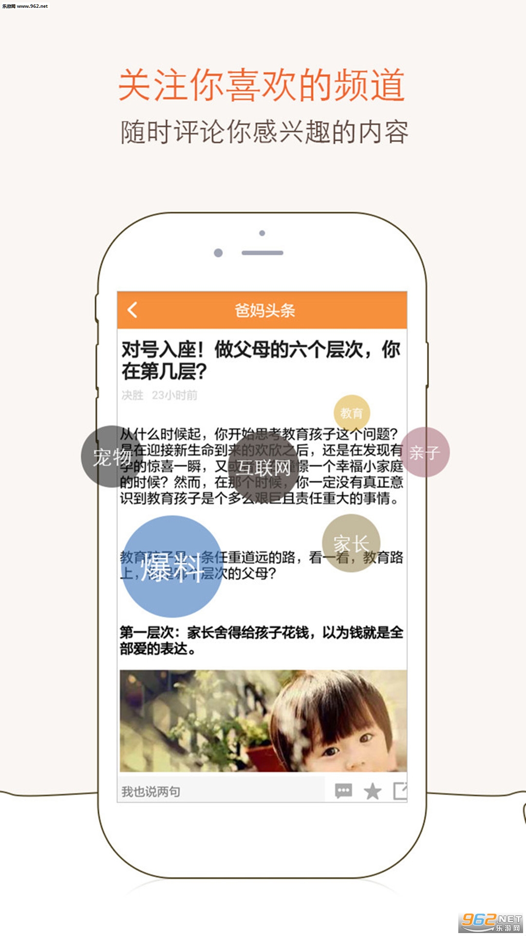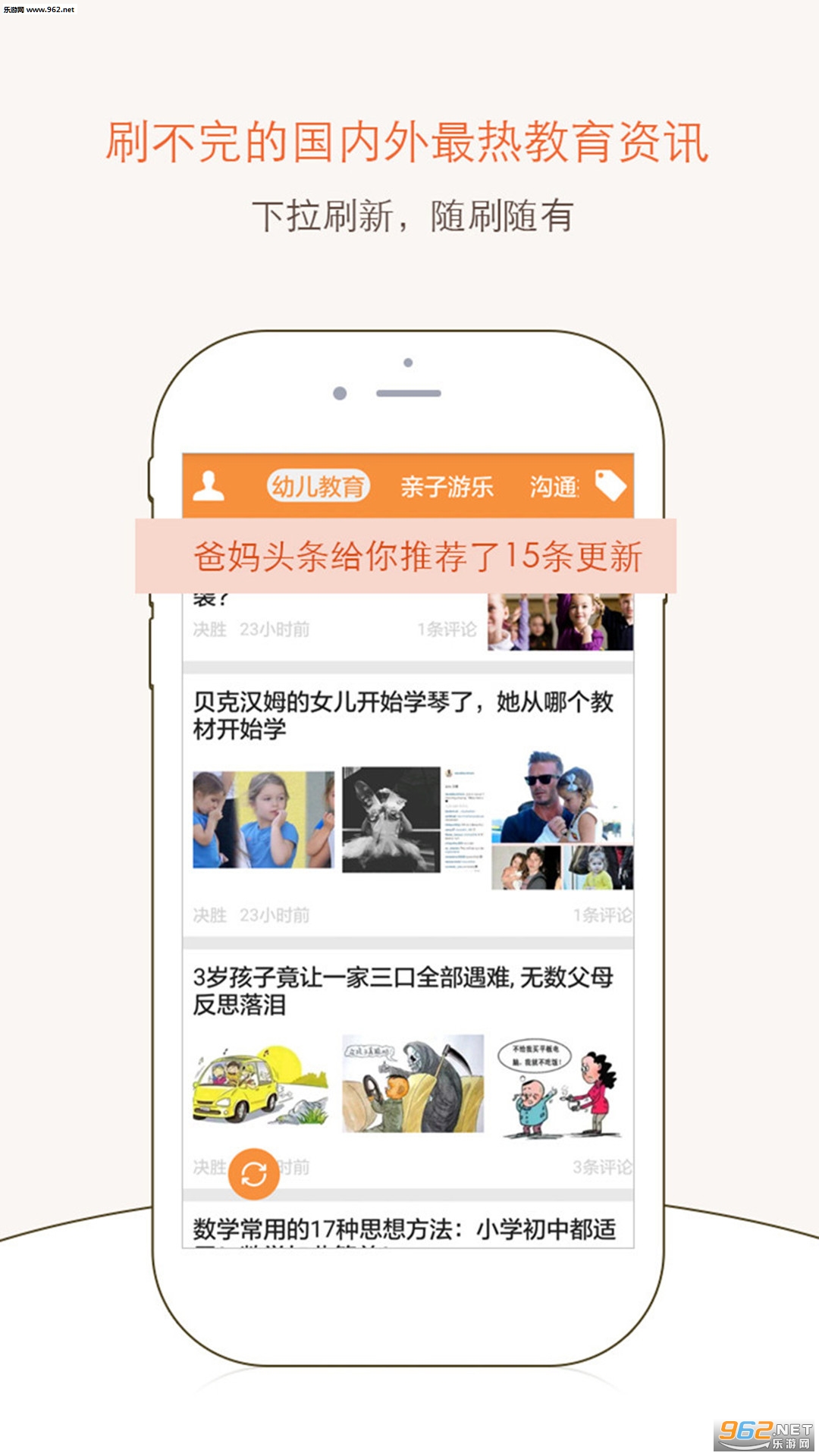 《爸妈头条app》是一款育儿主题的健康相关资讯阅读应用软件,准爸爸准妈妈,家有小宝宝的朋友们,可以装备本软件,集合全球最先进的育儿知识,给宝宝一个良好的成长环境,父母要多多学习哦!